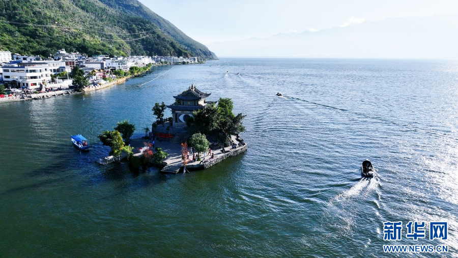 大理市挖色镇海印村,参加洱海鱼类生态调控的渔民驾驶船只,驶过小普陀景区附近水域(摄于11月12日)。新华网 赵普凡 摄