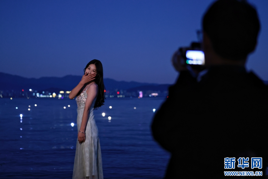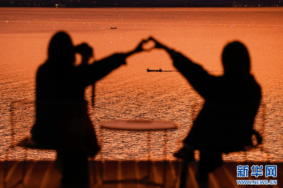 两名游客在洱海畔摆好造型,拍摄“渔灯照”(摄于11月13日)。新华网 赵普凡 摄