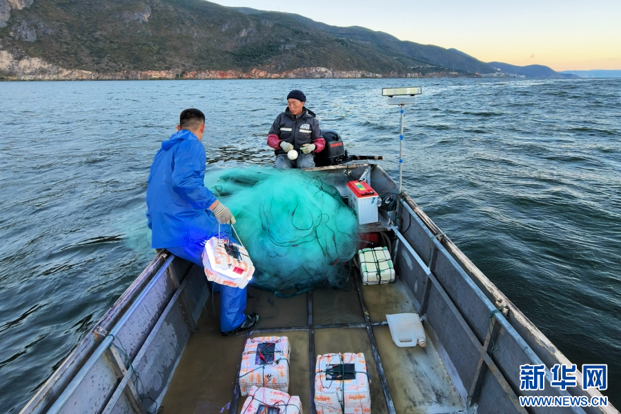 渔民杨瑞兴(右1)正在洱海里下渔网、布渔灯(摄于11月12日)。新华网 赵普凡 摄